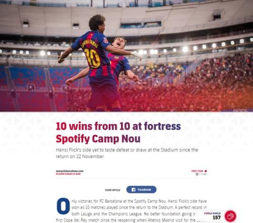 新诺坎普球场是巴萨的福地,巴萨官方统计本赛季回归之后,球队打出的主场10连胜:
