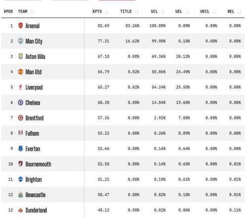 随着英超第28轮比赛的结束,英超积分榜也发生了一定的变化,其中最受关注的自然还是曼城和阿森纳之间的冠军之争。本轮比赛阿森纳是力克切尔西拿到了比赛的胜利,曼城虽然也取胜但仍然在积分榜上落后阿森纳5分。数据分析机构在本轮比赛全部结束后更新了英超的夺冠概率,中阿森纳83.26%领跑,曼城16.62%,维拉0.08%,曼联和利物浦0.02%,这也是有可能夺冠的全部球队。