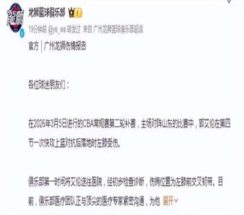 郭艾伦最新伤情报告出炉了。广州队在昨天与山东队的补赛中,比赛进行到第四节还剩下6分钟时,郭艾伦带球突进,在对抗不是很大的情况下不幸倒地,他痛苦捂着受伤的部位在地板翻滚,且还用力拍打地板极为痛苦,后被担架车推送到场外。