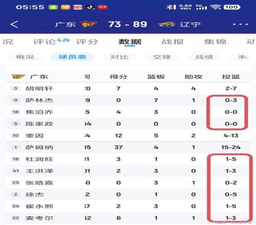 实话实说,广东队这场比赛,打得是要多难看,有多难看。3个首发球员,萨林杰3投0中,焦泊乔0投篮,陈家政0投篮,3人合砍4分,运动战1分没得;再看下替补球员,杜润旺5中1,王洪泽3中1,张皓嘉2中0,徐杰5中0,崔永熙5中1,麦考尔3中1。6名替补合计23投4中,这球还打个鬼哟……