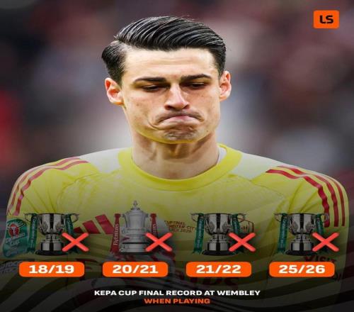 至此,凯帕职业生涯在温布利4次出战杯赛决赛全部失利,分别是2018-19赛季英联杯(切尔西)、2020-21赛季足总杯(切尔西)、2021-22赛季英联杯(切尔西)和2025-26赛季英联杯(阿森纳)。