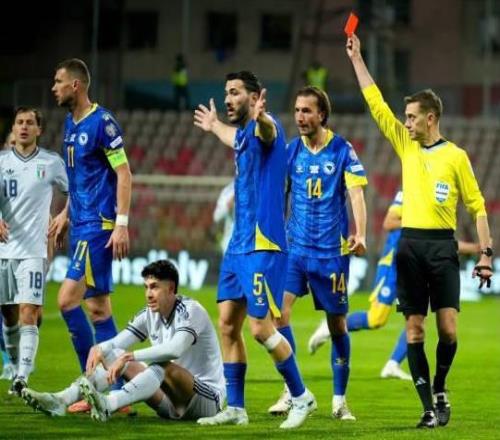 据报道,在与波黑的附加赛决胜局中,意大利在点球大战中失利,连续第三次无缘世界杯,巴斯托尼在第41分钟因对梅米奇的犯规被直接红牌罚下,使得他的球队在整个下半场和加时赛中都少一人。