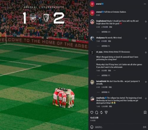 在英超第32轮一场焦点战中,阿森纳爆冷在主场1-2不敌伯恩茅斯,最近4场比赛输掉了3场。而北京时间4月12日,失望的阿森纳球迷纷纷涌入俱乐部官推的本场战报下面留言。阿森纳球迷的评论,尽是愤怒、哀叹和对俱乐部的怒其不争。