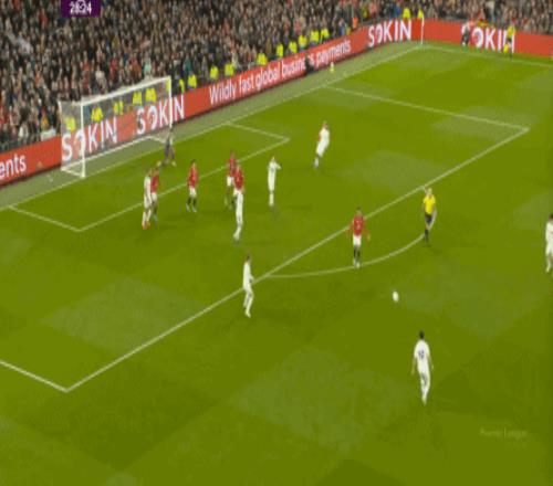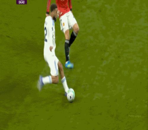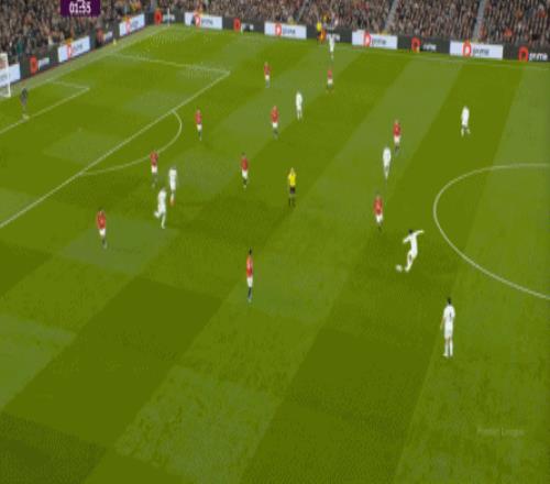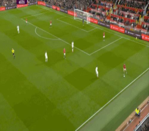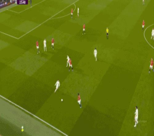 这一点还没完,第29分钟,利兹联先是在前场用身体抢断布鲁诺,获得了可以继续比赛的许可,大范围转移到右路之后,直接用45度长传打到了门前: