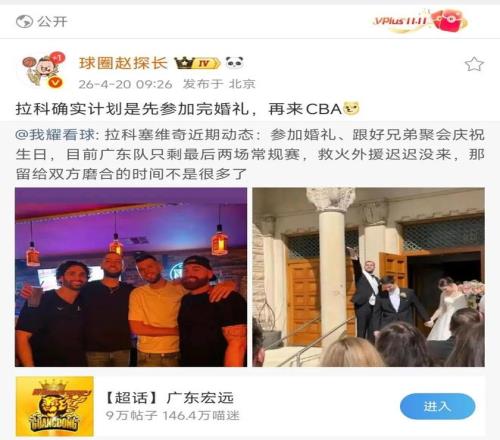 拉科塞维奇之前自宣加盟广东,广东现在还没有官宣,是因为他们有外援到队且完成注册手续才官宣的习惯。不过拉科很快就会和球队汇合了,根据最新消息,拉科将会在参加完朋友婚礼后正式启程出发前往中国。说实话,现在的广东确实不是一个拉科塞维奇就能拯救的,多一个拉科广东也很难改变本赛季的命运,但多一位大外来补充一下球队孱弱的内线也总是好事。现在的广东比较现实的目标,就是通过附加赛后全力对付北京,至于能否打赢北京那还得看届时球员们的状态和伤病情况了。