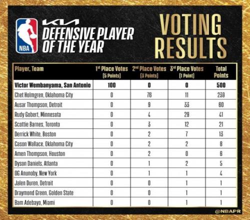 文班亚马获得了所有的100张第一选票,成为NBA历史上DPOY设立以来首位全票当选的球员。