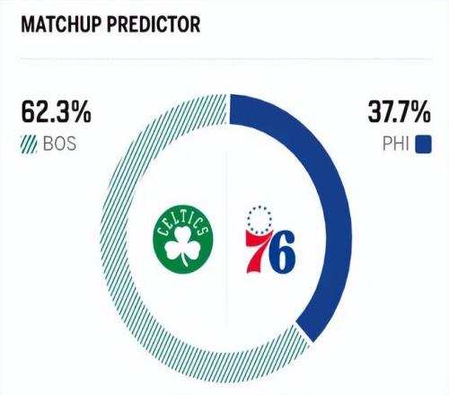 赛前,美媒ESPN对本场比赛进行了胜率预测,凯尔特人胜率依旧高达62.3% ,76人队胜率则回暖至37.7% ,但差距依旧明显。