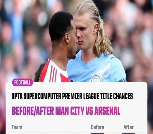 尽管曼城在英超天王山之战2-1战胜了阿森纳,但Opta的超级计算机依旧相信阿森纳大概率能夺得英超冠军。